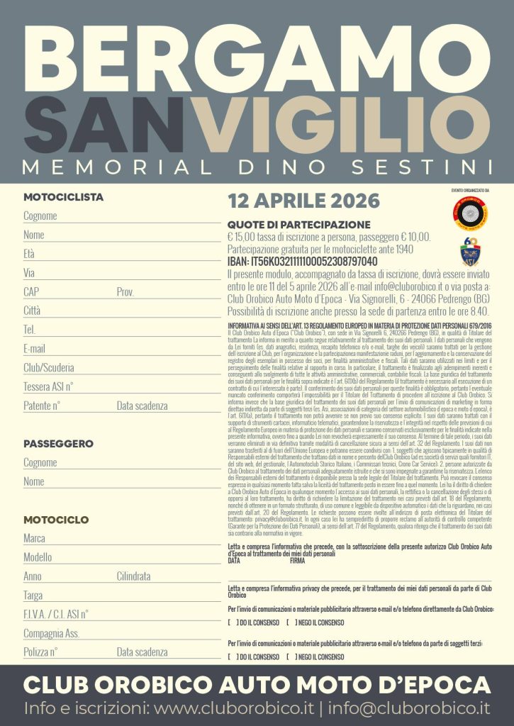 Club Orobico Auto Moto d’Epoca – Via Signorelli, 6 – 24066 Pedrengo (BG)