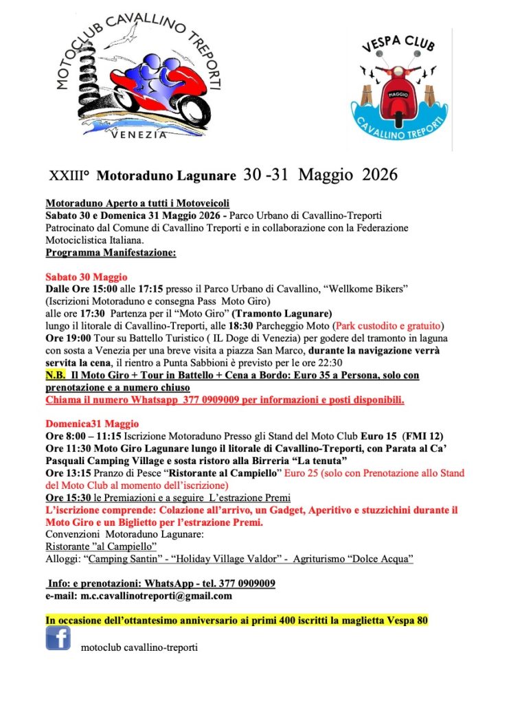 alle ore 17:30 Partenza per il “Moto Giro” (Tramonto Lagunare) lungo il litorale di Cavallino-Treporti, alle 18:30 Parcheggio Moto (Park custodito e gratuito)