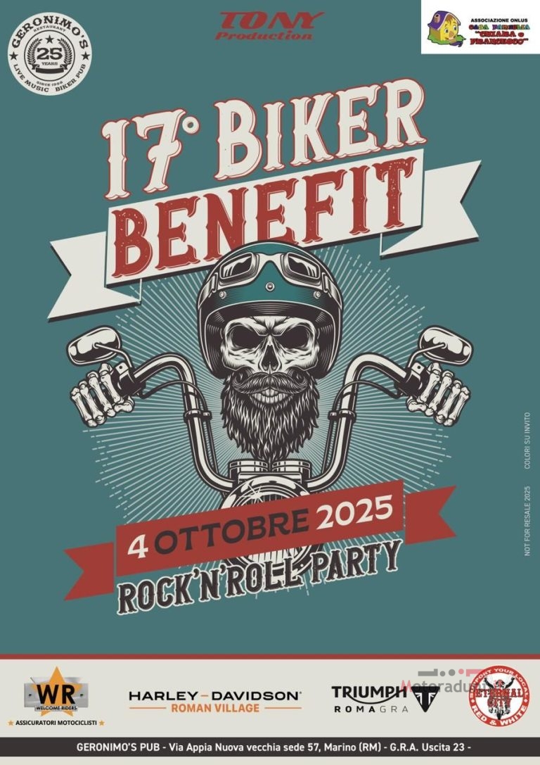 Il Biker Benefit e Rock’n’roll party ritorna per l’ Ottobrata Romana come le prime edizioni ad oggi arrivato al 17° anno grazie a voi e alla VS generosità per tutte le donazioni e la rituale Riffa di Beneficenza a favore della casa famiglia Chiara e Francesco grazie a tutti i premi messi a disposizione dalle societa Officine Ristoranti e Operatori del settore motoclistico a favore della casa famiglia Chiara e Francesco contro abuso sui minori che saranno operativi con uno stand all” interno della manifestazione Ospitata ormai da anni Dal Connubio Rodato tra il Geronimo’s Restaurant Live Music e Tony Production .
