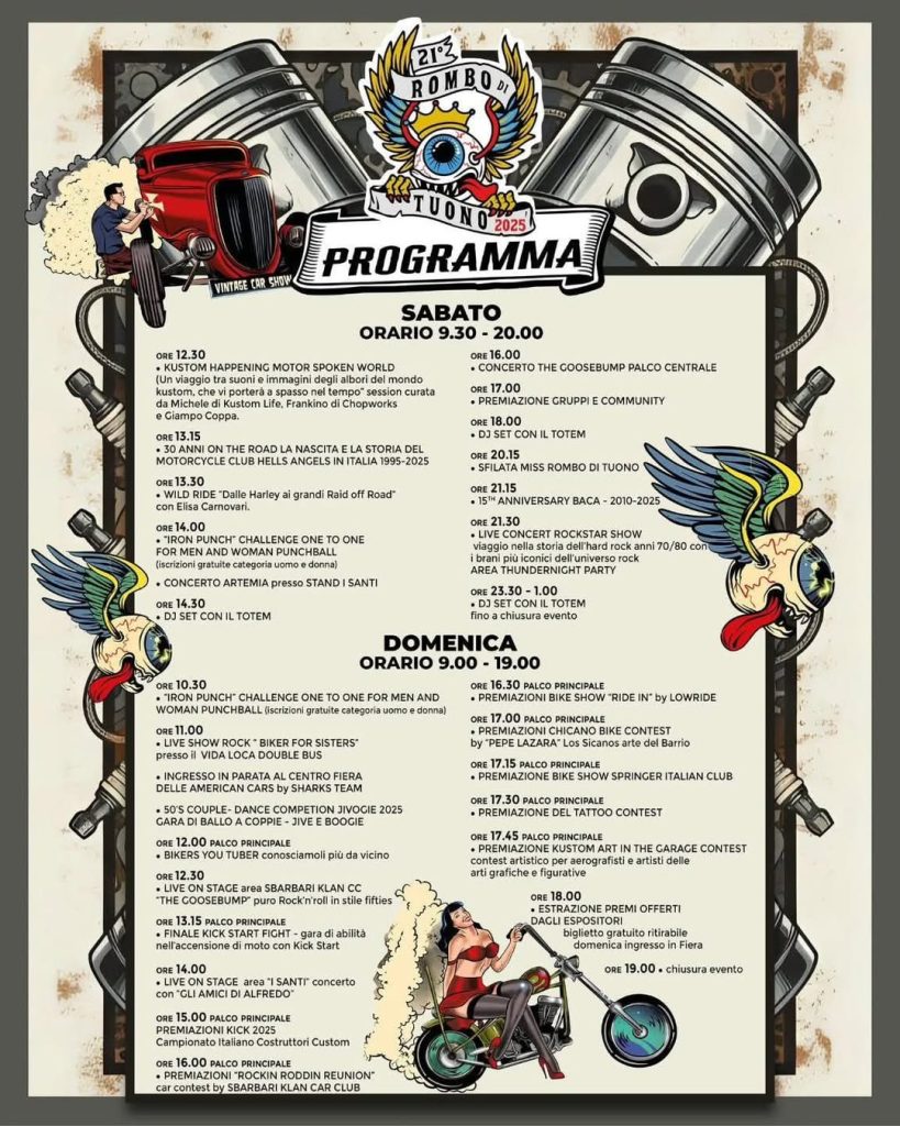 Torna a Rombo di Tuono 2025 il “CHICANO STYLE CONTEST“ ed il relativo run che si svolgerà nel pomeriggio di sabato nel centro città. Se possiedi una Chicana potrai esporre la tua Vicla nell’area all’interno del padiglione nel bike show. Mandaci una foto della tua moto per avere il pass d’ingresso e lo spazio per la tua moto in fiera.