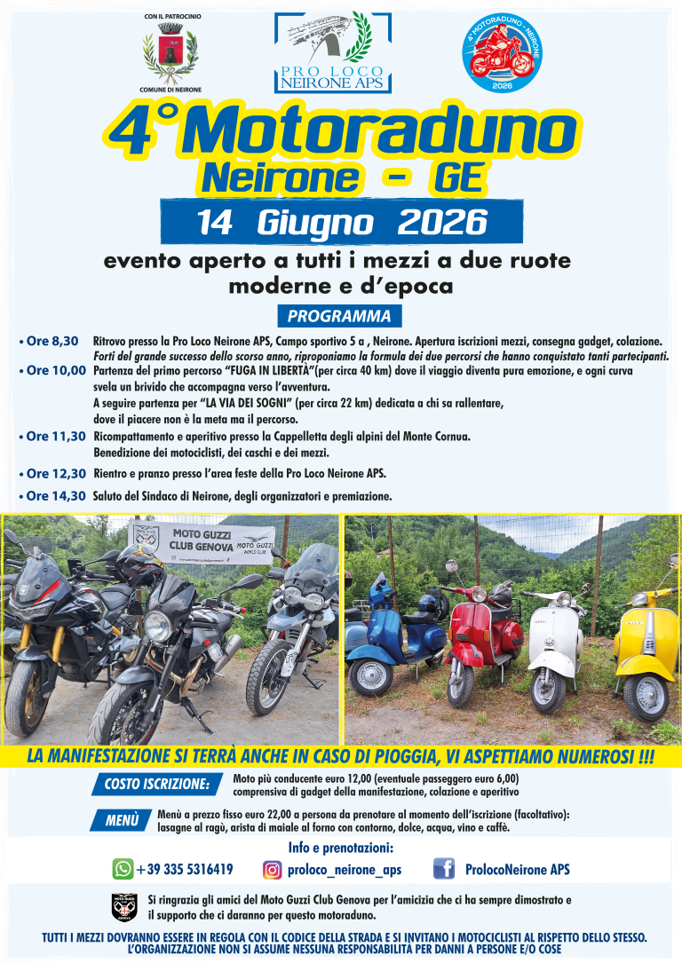 Torna domenica 14 giugno a Neirone (Genova) il 4° motoraduno organizzato dalla Pro Loco Neirone APS, evento aperto a tutti i mezzi a due ruote moderne e d’epoca. Forti del grande successo dello scorso anno riproponiamo anche quest’anno due percorsi; i partecipanti potranno decidere se affrontare il percorso “Fuga in libertà” o “La via dei sogni”.