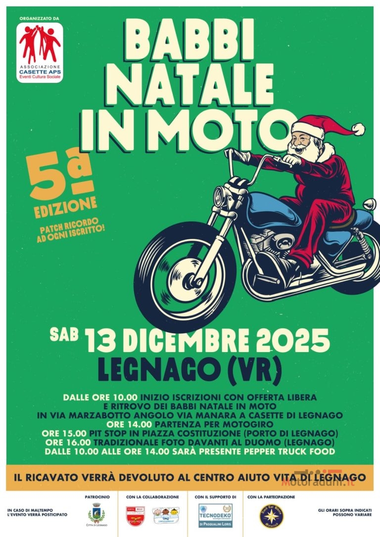 DALLE ORE 10.00 INIZIO ISCRIZIONI CON OFFERTA LIBERA E RITROVO DEI BABBI NATALE IN MOTO IN VIA MARZABOTTO ANGOLO VIA MANARA A CASETTE DI LEGNAGO