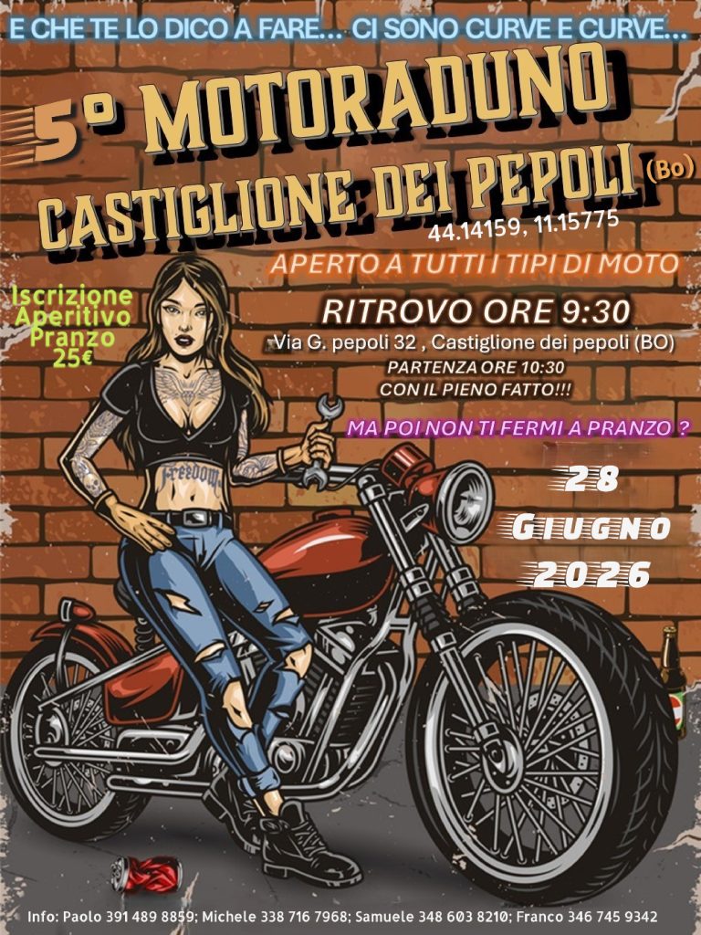 Sei pronto a far cantare il tuo motore tra le curve più belle del bolognese? Che tu abbia una sportiva, un’enduro, una custom o uno scooter, il 5° Motoraduno di Castiglione dei Pepoli è l’evento perfetto per chi ama i panorami mozzafiato del confine tosco-emiliano!!