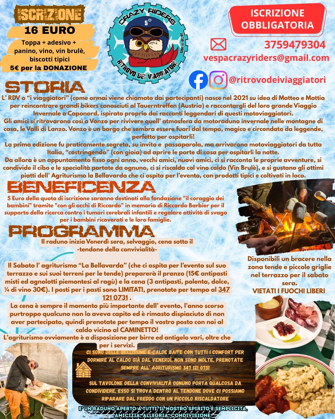 5° Ritrovo dei Viaggiatori, nelle Valli di Lanzo a 1231m. Ci troviamo come ogni anno tra amicizia, semplicità, allegria. La quota di iscrizione è 16 Euro, comprende toppa, adesivo, panino col formaggio, biscotti tipici e vino in abbondanza all’ arrivo, vin brulè all’imbrunire. Da questa cifra 5 Euro saranno devoluti alla fondazione “il coraggio dei bambini” tramite “con gli occhi di Riccardo” in memoria di Riccardo Barbier per il supporto della ricerca contro i tumori infantili e la promozione di attività di svago per i bambini ricoverati e le loro famiglie. CHIUSURA ISCRIZIONI 2 Novembre L’iscrizione si effettua a questo link: https://forms.gle/VqAPxR8hw3bi7NJ79 Tutte le altre info in locandina. Buona strada.