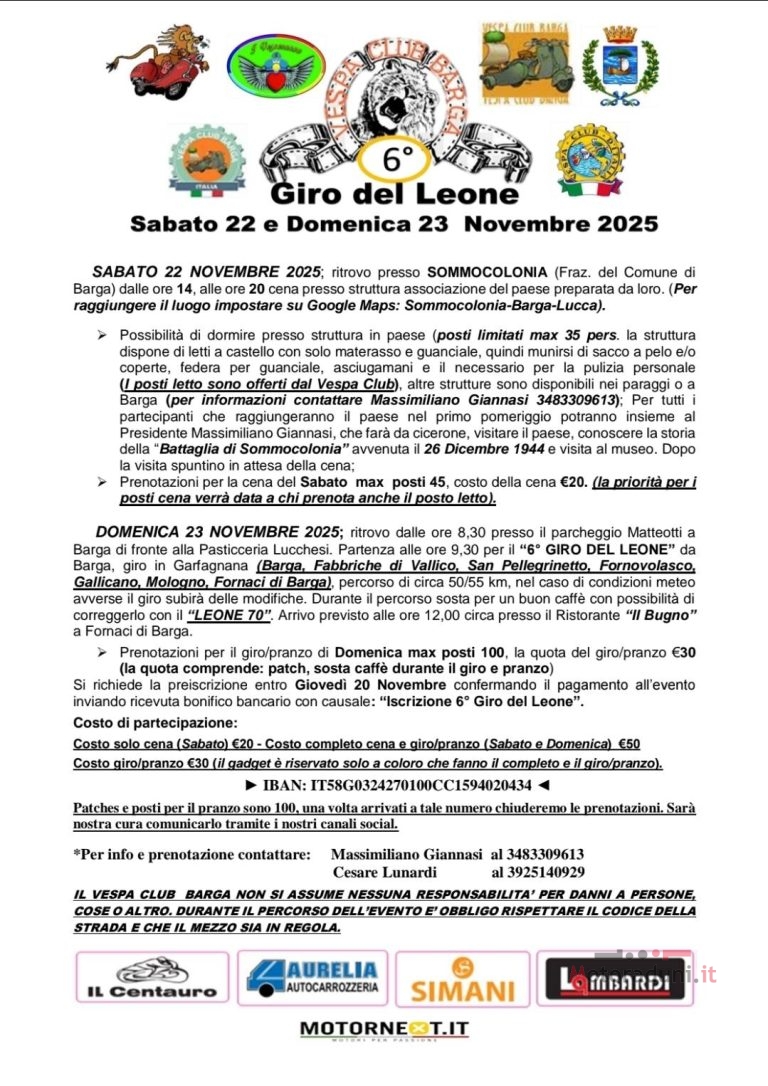 Si richiede la preiscrizione entro Giovedì 20 Novembre confermando il pagamento all’evento inviando ricevuta bonifico bancario con causale: “Iscrizione 6° Giro del Leone”.