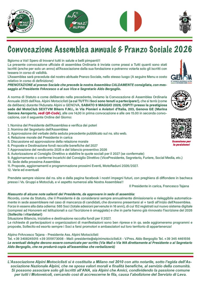 A norma di Statuto e come deliberato nella precedente, inviamo la Convocazione di Assemblea Ordinaria Annuale 2025 dell’Ass. Alpini Motociclisti (a cui TUTTI i Soci sono tenuti a partecipare!), che si terrà (come da delibera) durante l’Adunata Alpini a GENOVA, SABATO 9 MAGGIO 2026, OSPITI presso la prestigiosa sede del MotoClub SEXTVM Bikers F.M.I., in Via Pionieri e Aviatori d’Italia, 203, Genova GE (Marina Genova Aeroporto, vedi QR-Code), alle ore 14,00 in prima convocazione e alle ore 15.00 in seconda convocazione, con il seguente Ordine del Giorno: