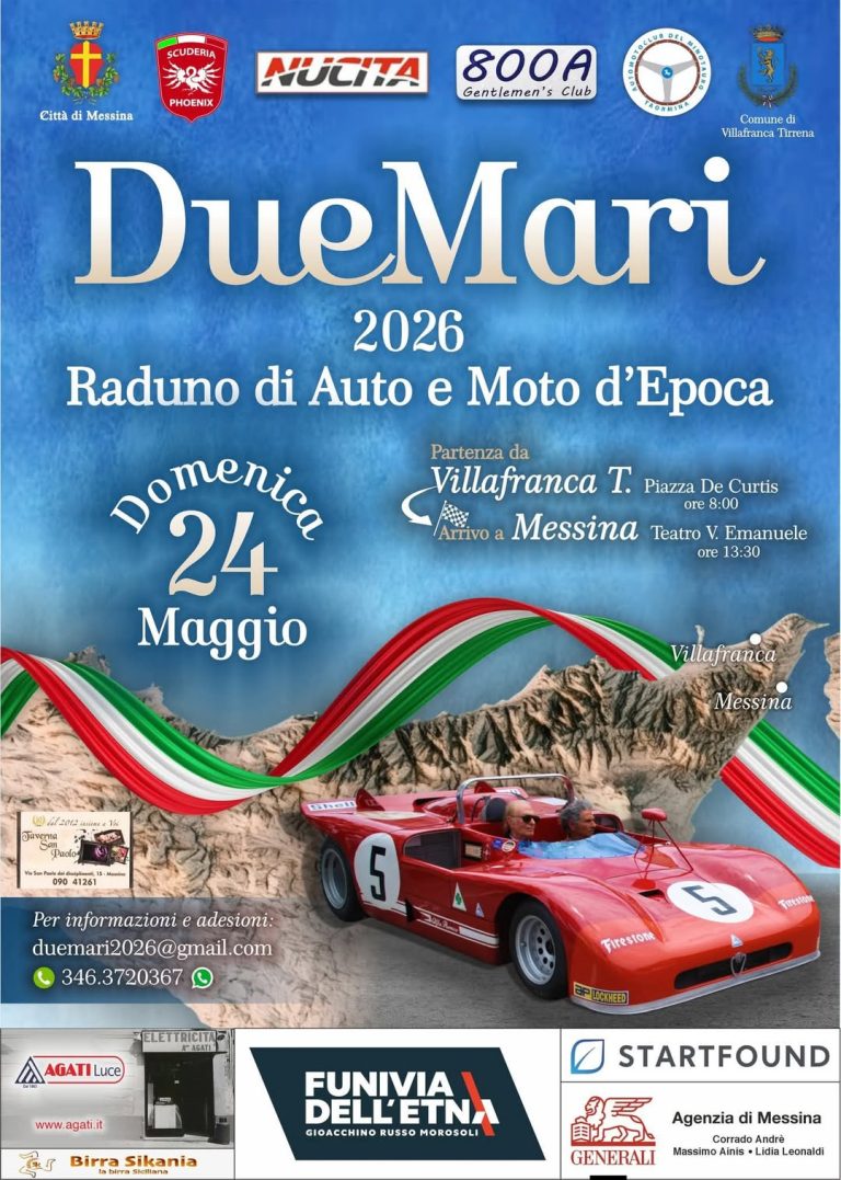 Domenica 24 maggio 2026 torna l’atteso appuntamento con DueMari, il raduno dedicato agli appassionati di auto e moto d’epoca, che porterà sulle strade tra Villafranca Tirrena e Messina, un affascinante viaggio nel tempo tra eleganza, storia e passione motoristica.