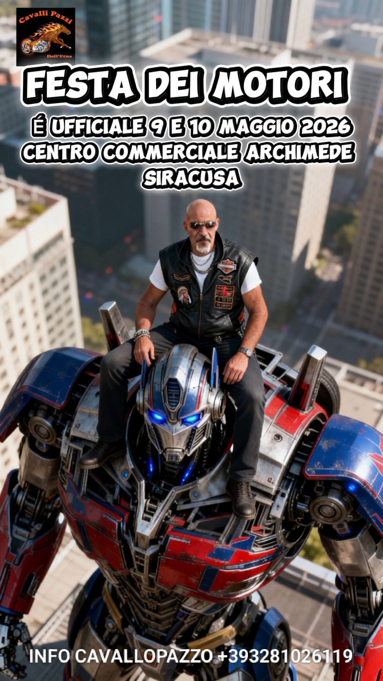 Salve a tutti fratelli Bikers come ogni anno iniziano i nostri Moto Raduni la festa dei Motori è UFFICIALE 9 e 10 MAGGIO 2026 per la festa dei Motori al centro commerciale Archimede di Siracusa Sicilia. L’evento prevede: esposizione mostra scambio, moto di ogni genere, Harley Davidson, auto d’epoca, sfilate Ferrari, giochi Transformers, animazione e tante sorprese vi aspettiamo numerosi come ogni anno.