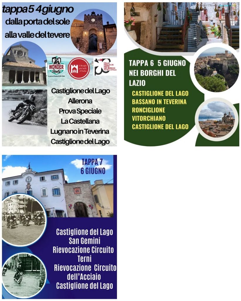 Il Borgo dove faremo base per l’intera durata della manifestazione è Castiglione del Lago dove arriveremo nella serata del 30 maggio e dove sarà allestita un’area di accoglienza ed un “parco chiuso” dove potranno essere parcheggiati i mezzi al seguito.