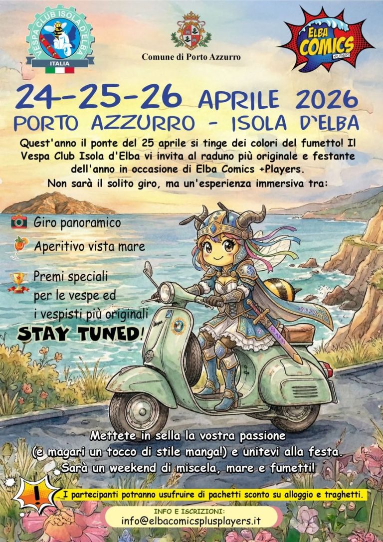Quest’anno il ponte del 25 aprile si tinge dei colori del fumetto! Il Vespa Club Isola d’Elba vi invita al raduno più originale e festante dell’anno in occasione di Elba Comics +Players.