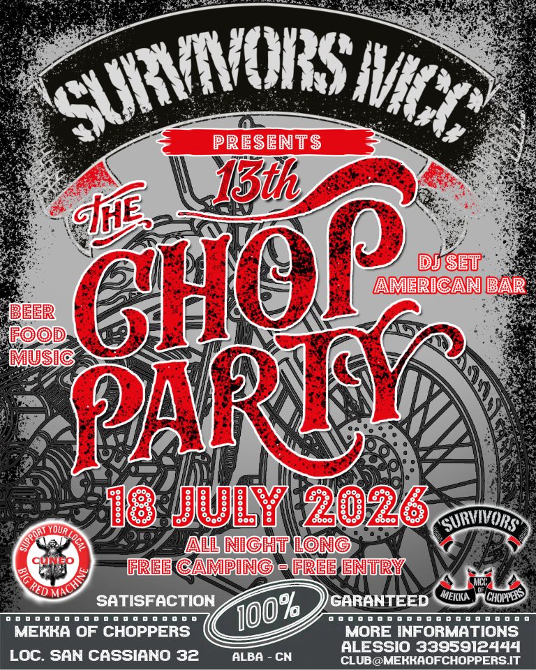 Vi aspettiamo il 18 luglio 2026 per festeggiare il 13° Chop Party dei Survivors MCC Italy alla Mekka of Choppers.